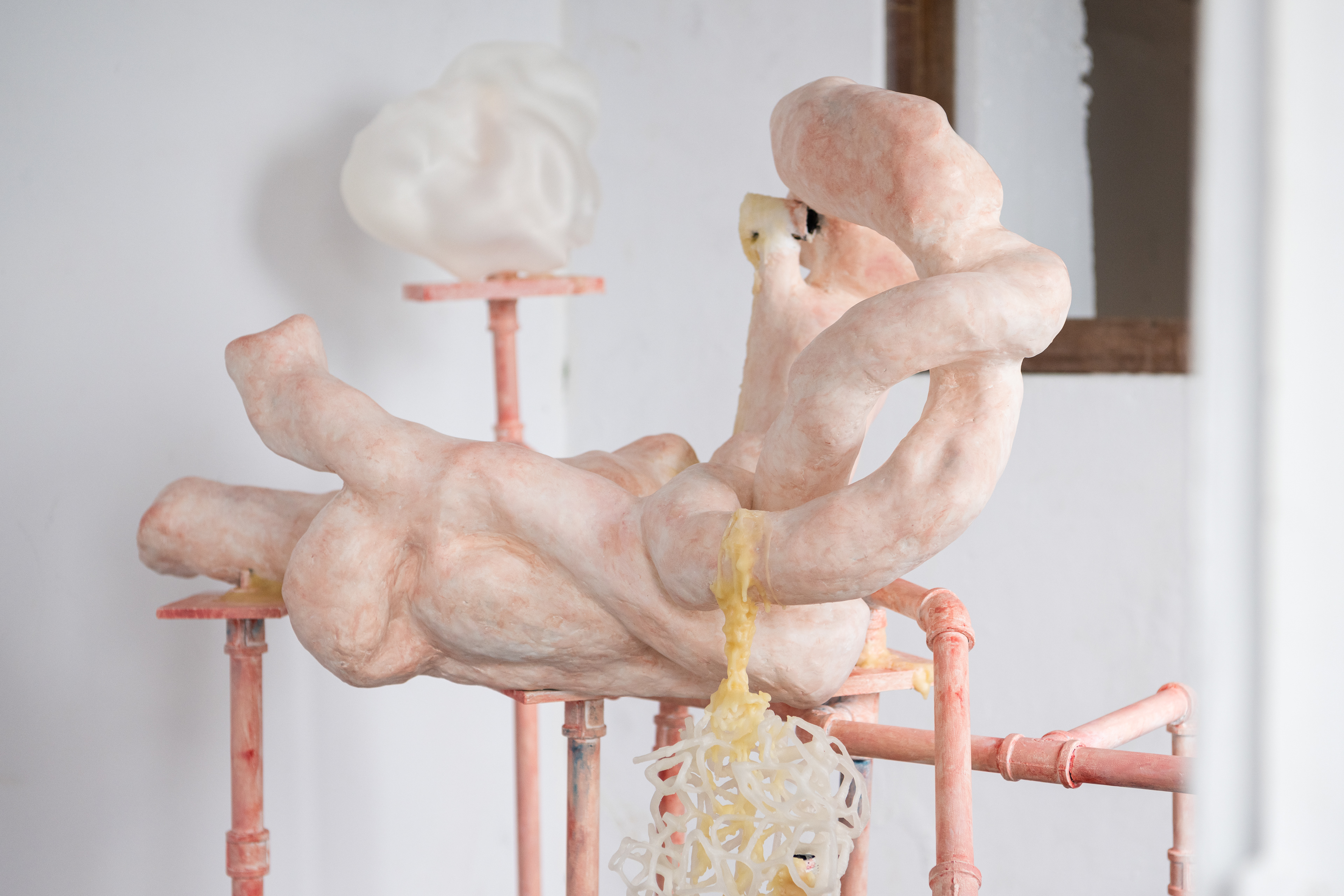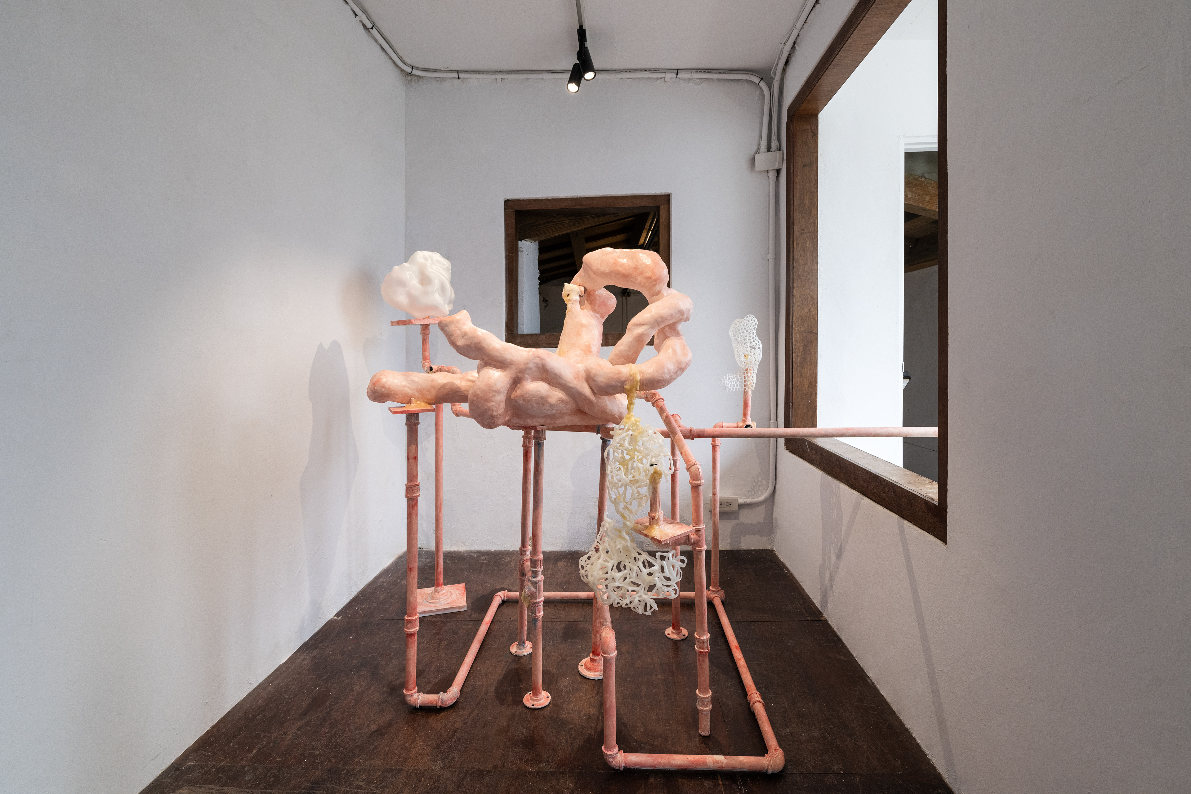 <Untitled I>, 60cm x35cm x 50cm, 파이프, 나무, 석고, 지점토에 채색, 2024