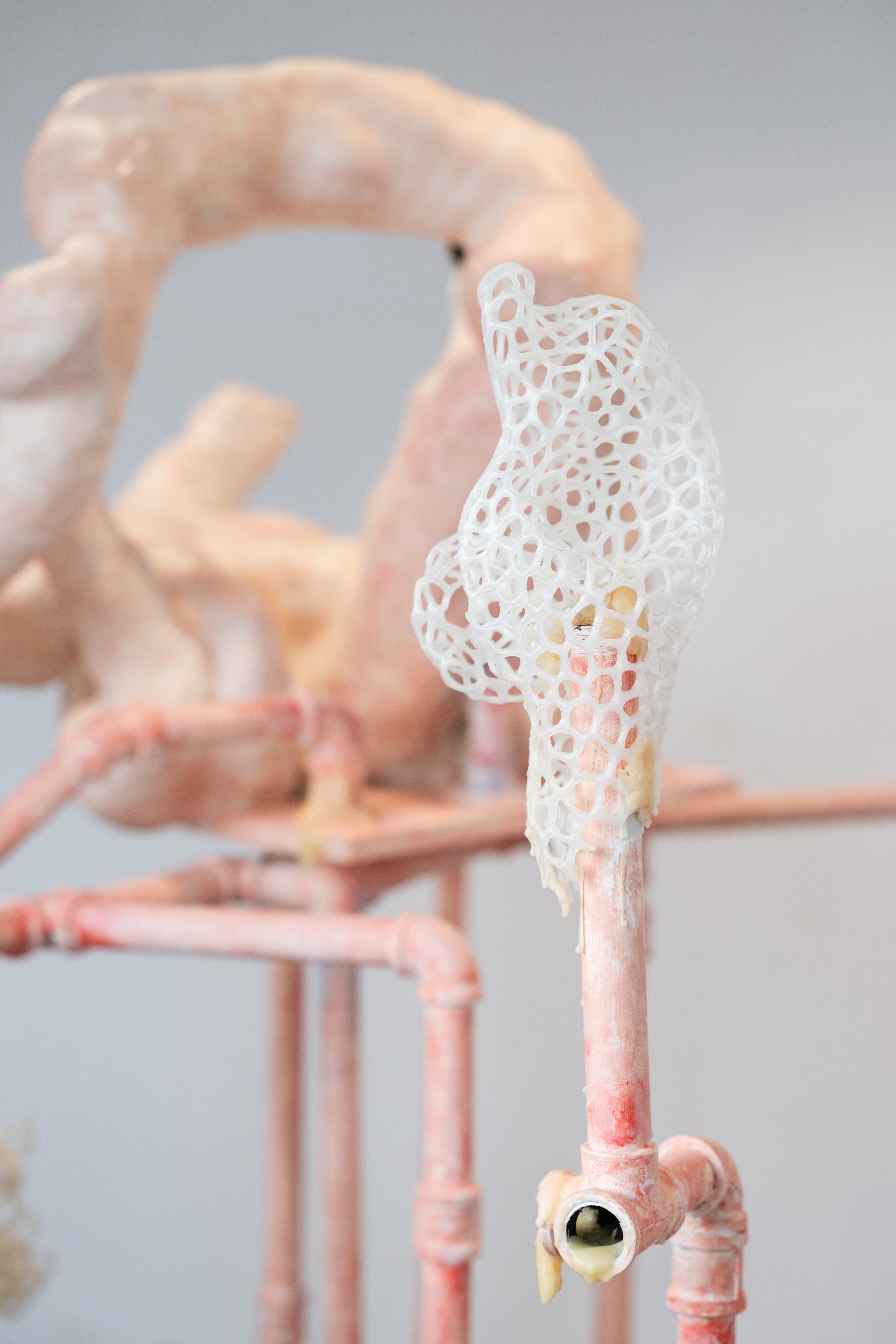 Untitled II 부분, 12m x 1.5m x 1.3m, 3D print, 파이프, 나무, 석고, 지점토에 채색, 2024